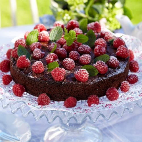 Smelt sjokoladen og sirupen over vannbad. Rør til det har blitt en smidig krem. Hell blandingen over i en bolle og sett kjølig. Rør i kremen hvert 5. minutt til den er smørbar. Fordel den over kaken. Pynt med det du måtte ønske, for eksempel sølvkuler og bringebær.