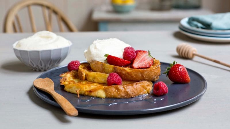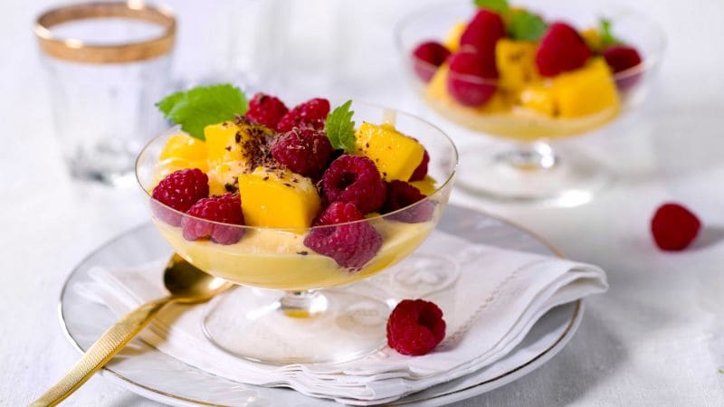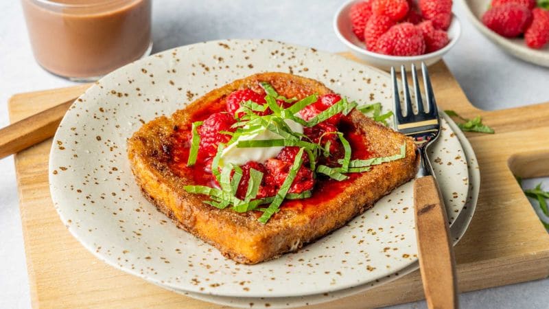 Frisk opp frokostfavoritten arme riddere med vaniljesaus og en deilig fruktsalat av mango, jordbær og basilikum. Det er lov å unne seg litt ekstra vaniljesaus ved siden av.