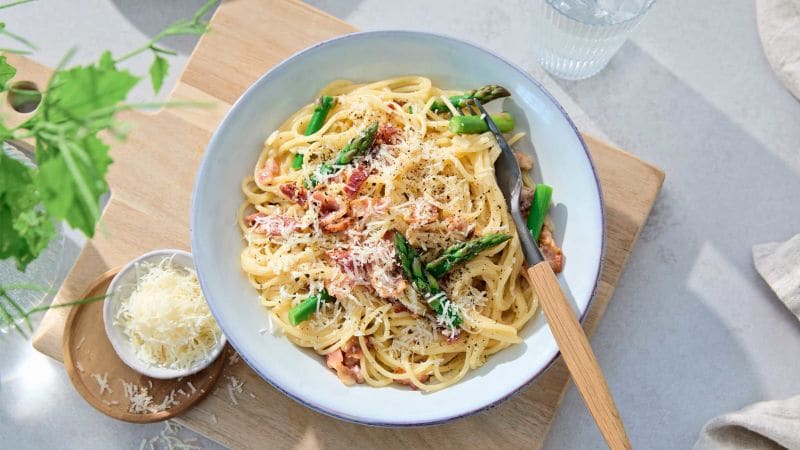En fristende langpannepizza kan lages på mange måter! Her har vi byttet ut den tradisjonelle tomatsausen med Crème Fraîche. Toppet med asparges, god spekeskinke og basilikum er dette en pizza du garantert vil like.
