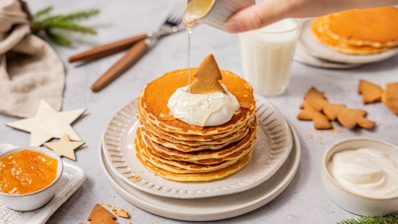 Disse proteinrike pannekakene med smak av appelsin og kanel er perfekt til julefrokosten, julelunsjen eller når du har lyst på noe godt og proteinrikt. Ekstra digg blir det hvis du topper dem med vaniljekesam og pepperkaker.