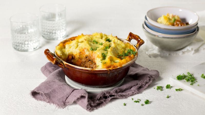 En britisk klassiker som har en stadig økende popularitet på norske middagsbord. Fyldig kjøttgryte av lam eller annen type kjøtt og med potetmos som gratineres på toppen.