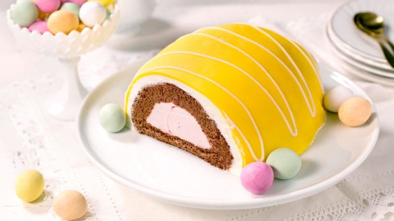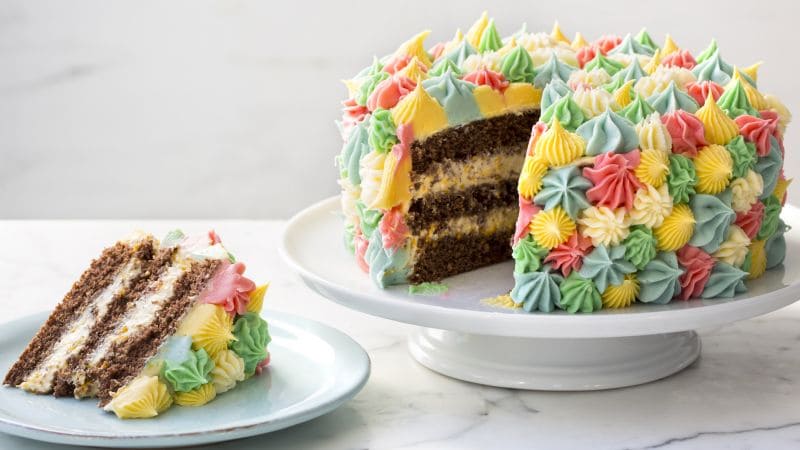 En skikkelig tre-lags festkake som er perfekt til påske. Saftig sukkerbrød er fylt med mandarinkrem, appelsinmarmelade og pyntet med deilig smørkrem i mange farger.
