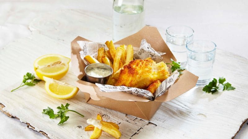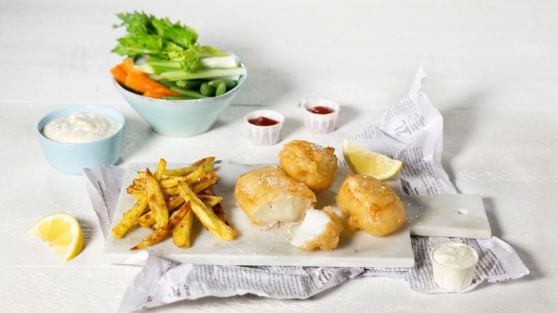 Du trenger ikke å dra til England for å spise klassikeren fish`n`chips. Dette er en flott hverdagsmiddag som ikke krever for mye. Her serveres ovnsbakte poteter som «chips» og grønnsaker og fetadipp som tilbehør.