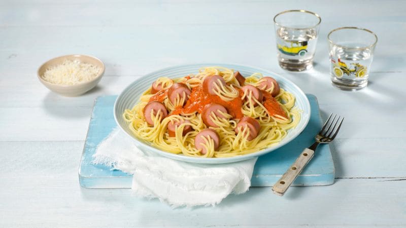 Ukens morsomste middag! Pølsebiter forvandles til edderkopper ved å tre spagetti gjennom pølsene før koking. Servert med tomatsaus blir dette barnas favoritt.