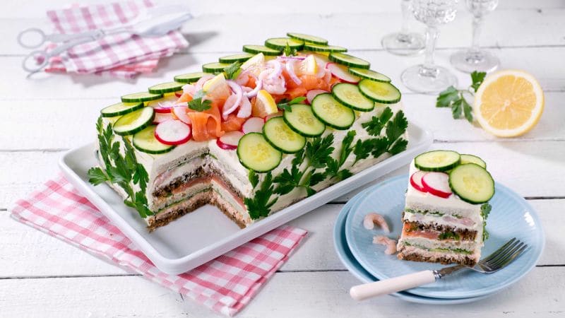 En svensk delikatesse som gjør seg på koldtbordet eller til lunsj med mange mennesker. Her i denne smørbrødkaken ligger både lyst og mørkt brød lagvis med forskjellig sjømat og sauser og til slutt dekket med kremost. Husk at smørbrødkaka må stå kaldt et par timer slik at den setter seg.