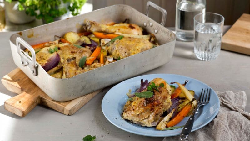 Helstekt kylling blir saftig og god middag uten for mye jobb. Her serveres den med italiensk salsa verde, en grønn pesto av persille, sitron, parmesan og olivenolje.