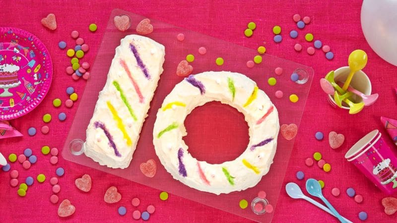 Oppskrift på morsom tallkake til tiåringens bursdagsselskap. Gled både barn og voksne med kaken som er formet som et 10-tall. Lag en mørk sjokoladekake med ostekremtopping, og pynt kaken med alt som er gøy og godt av strøssel.
