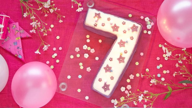 Oppskrift på morsom tallkake til syvåringens bursdagsselskap. Gled både barn og voksne med kaken som er formet som et 7-tall. Lag en mørk sjokoladekake med ostekremtopping, og pynt kaken med alt som er gøy og godt av strøssel.