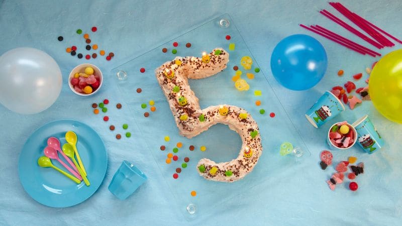 Oppskrift på morsom tallkake til femåringens bursdagsselskap. Gled både barn og voksne med kaken som er formet som et 5-tall. Lag en lys kakebunn med ostekrem på toppen. Slå deg løs med farger og pynt, og dere er klar for fest!