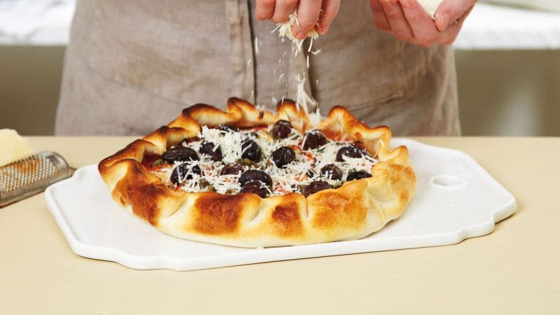 En fristende langpannepizza kan lages på flere måter. Denne har sprø, tynn bunn og er toppet med hvit saus, soltørkede tomater, spekeskinke og ruccola.