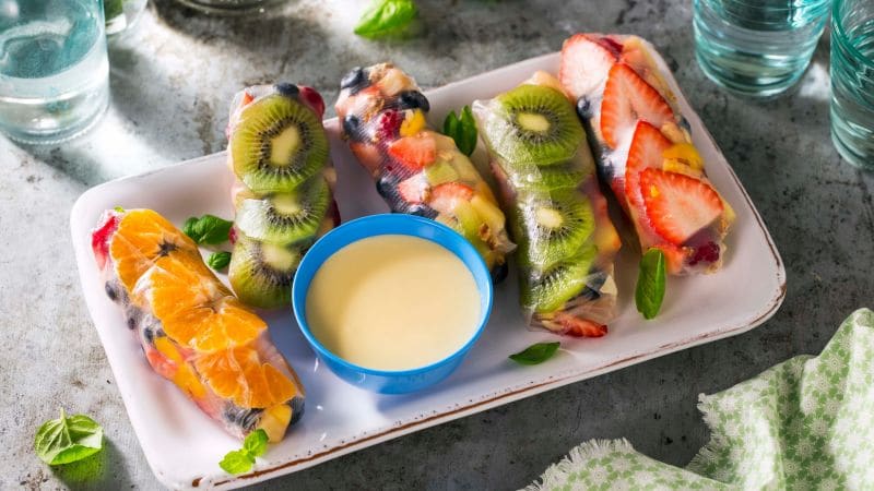 Ferske vårruller fylt med søte frukter og bær er gøy å servere som dessert. Vi har brukt ananas, mango, klementiner og bær i våre, men bruk det du liker best, og server med en deilig vaniljesaus til!