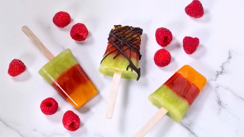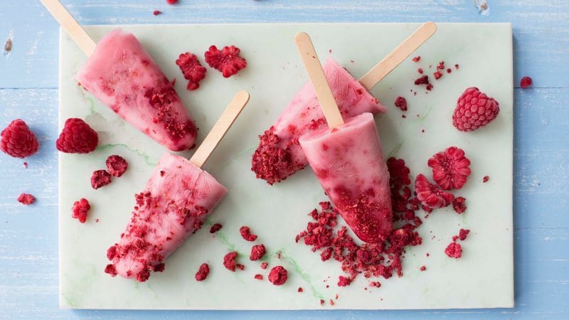 Du lager enkelt din egen pinneis ved å fryse Biola®. Her er ispinnen marmorert med rørte bringebær og pyntet med frysetørkede bær. Husk at isen må stå i fryseren til den blir stiv, gjerne over natten.