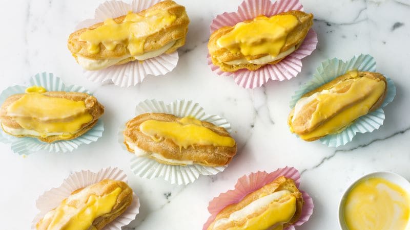 Eclairs, eller fylte vannbakkels, smaker utrolig godt og er en klassiker innen bakeverk. Disse er fylt med vaniljekrem og toppet med gul applesinglasur.