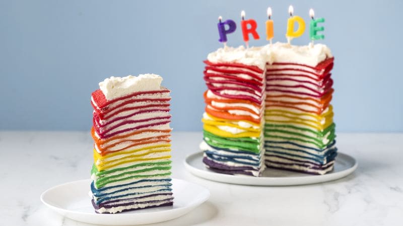 Enten du vil feire Pride eller bare er glad i masse farger, så er denne regnbue-pannekakekaken morsom å sette på bordet. Det blir garantert god stemning med en gang!