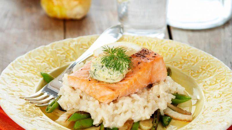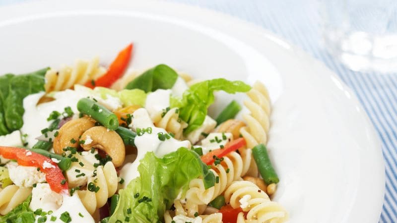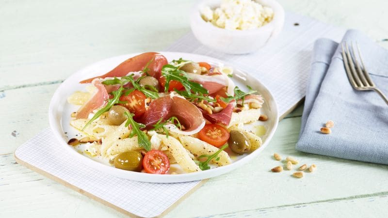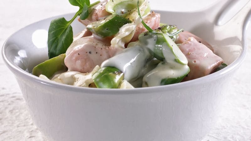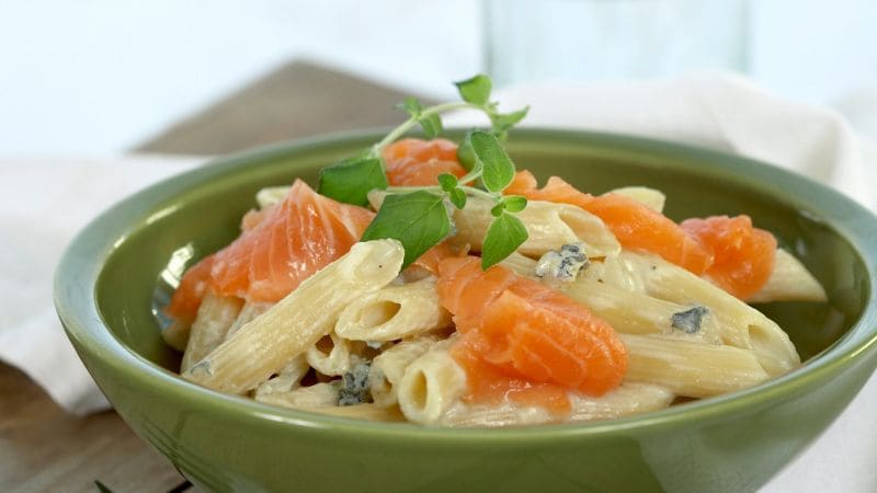 Både fersk laks og røkelaks er godt sammen med pasta. Her er en oppskrift på en fristende pastarett med laks og saus av crème fraïche, fetaost og hakkede oliven.