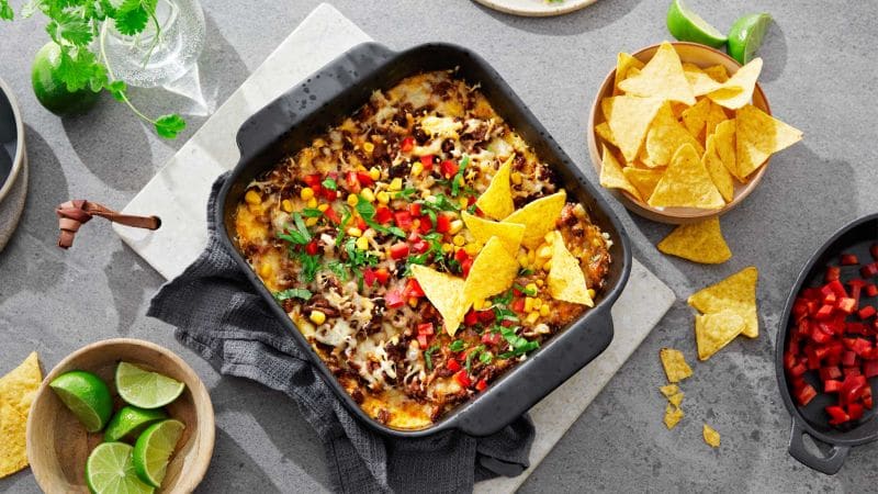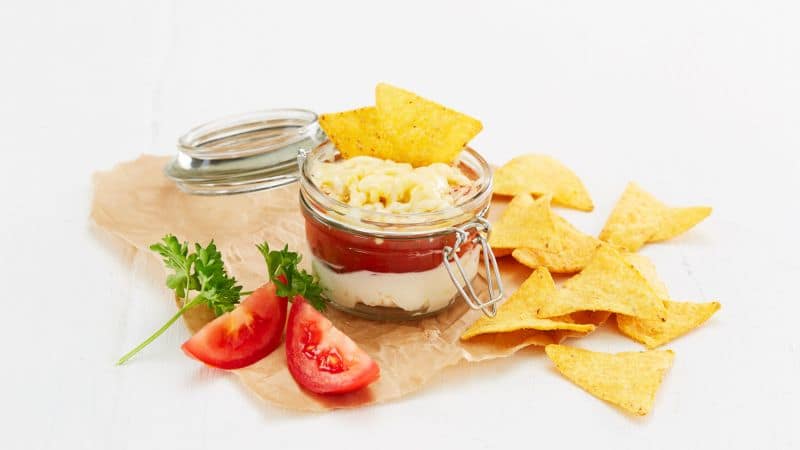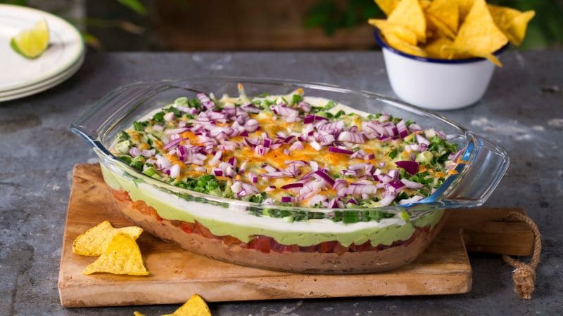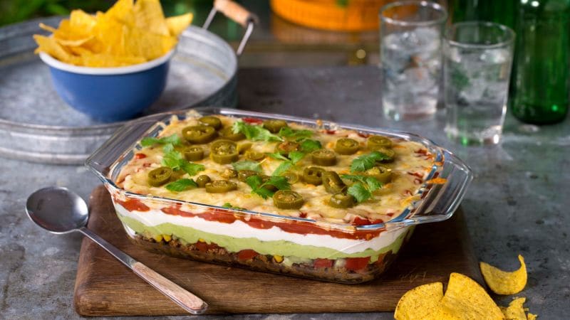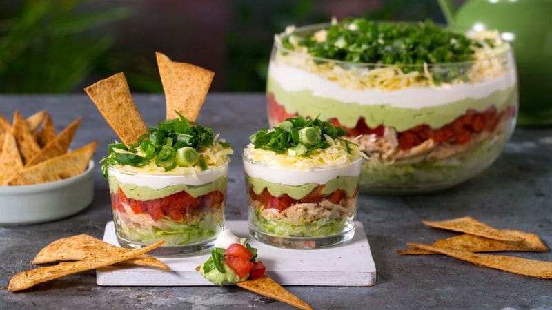 Dette er en frisk variant av 7 layer taco dip med kylling og friske grønnsaker. Server den i en stor form som alle kan forsyne seg av eller i porsjonsglass med hjemmelagede tortillachips.