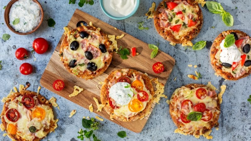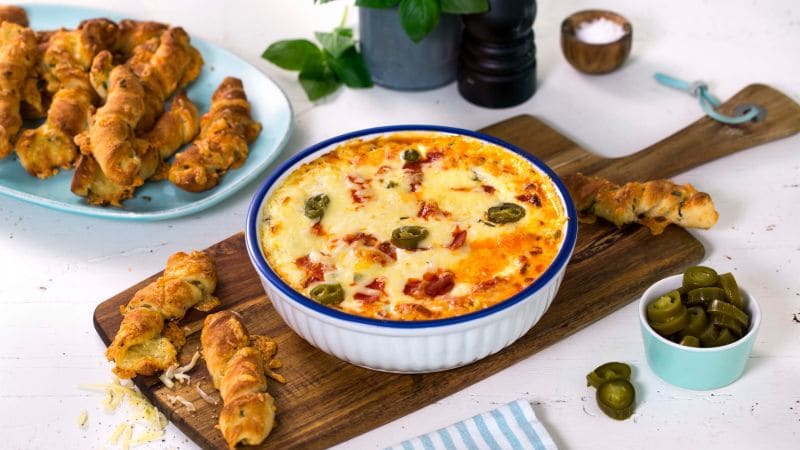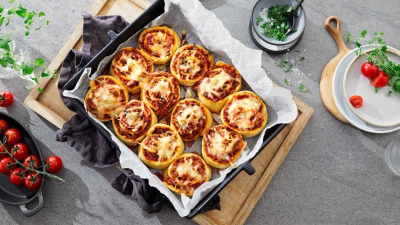 Fylte pizzatots med Norvegia®, salami og tomatsausdipp - som et alternativ til pizza eller pølser i barnebursdagen, eller som gøyal fingermat på voksenfesten.