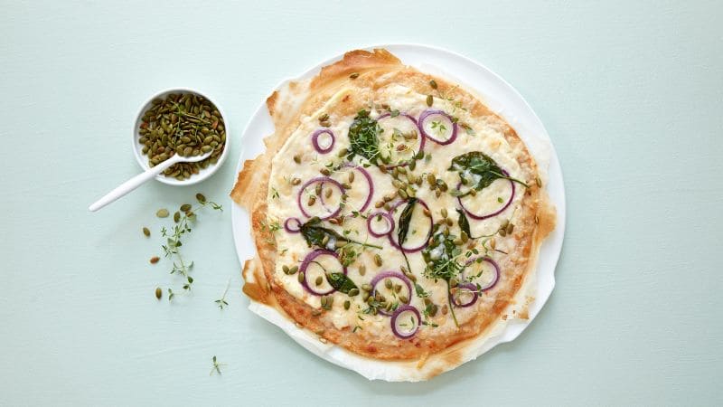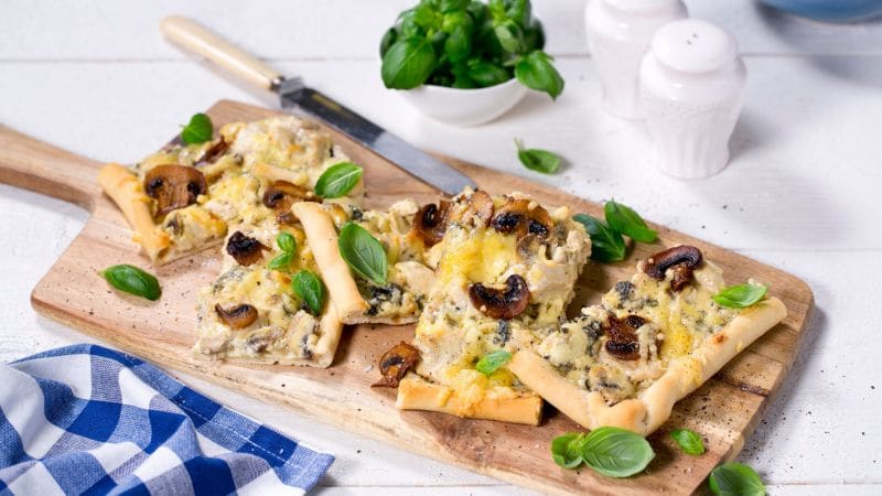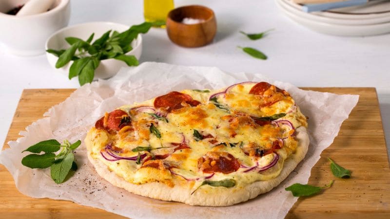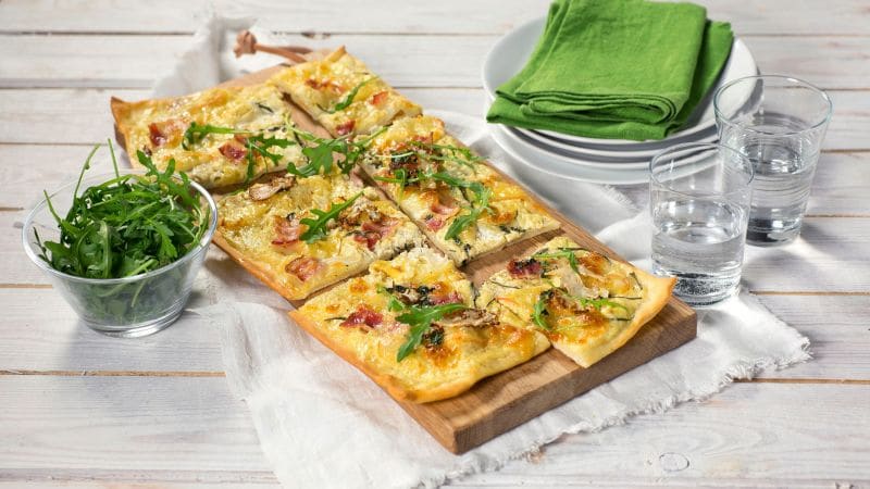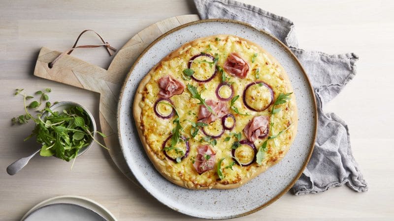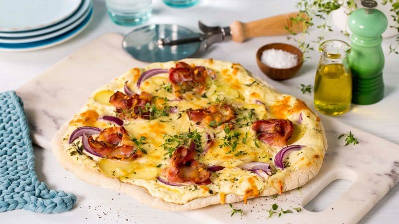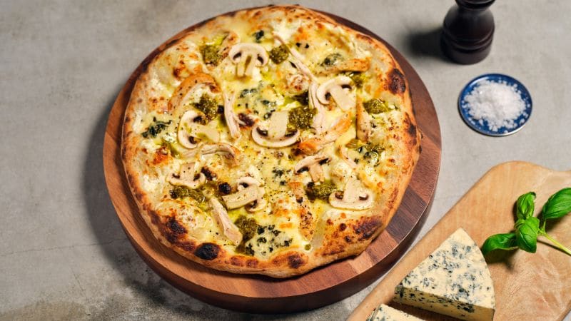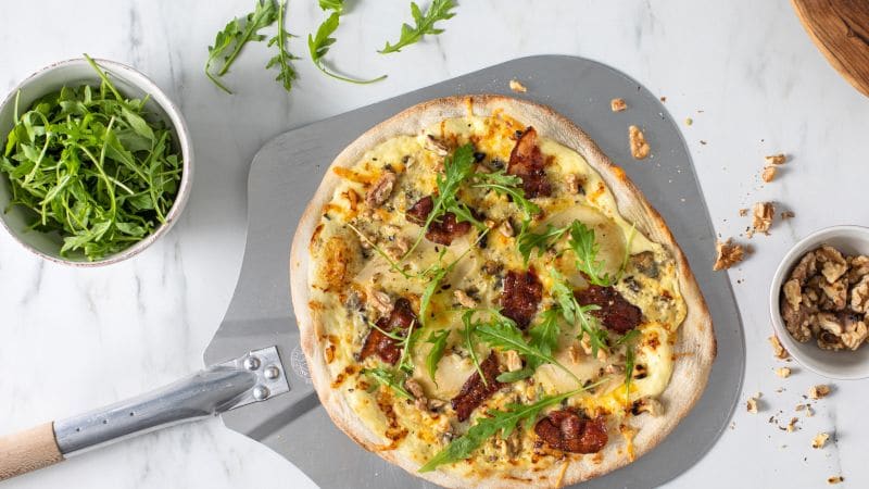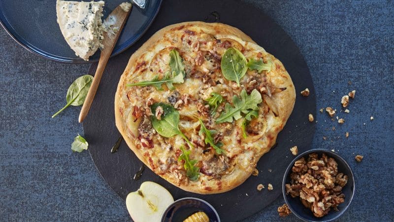 Gi deg selv og dine gjester en spennende smaksopplevelse med denne pizzaen! Den inneholder en nydelig kombinasjon av blåmuggost, bacon, crème fraîche og eple.