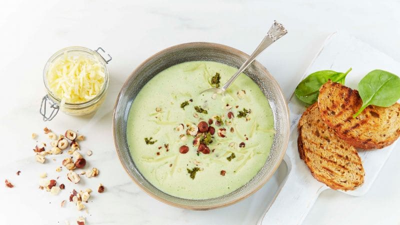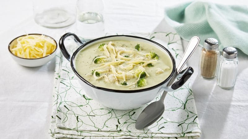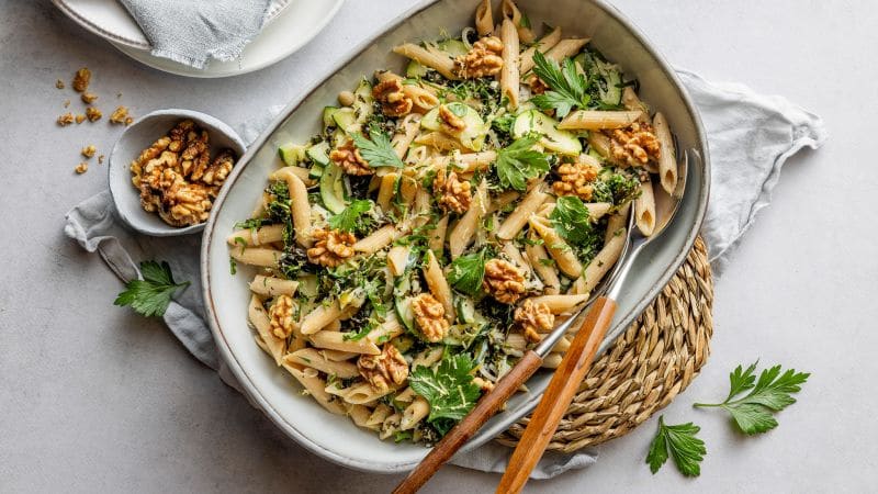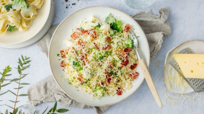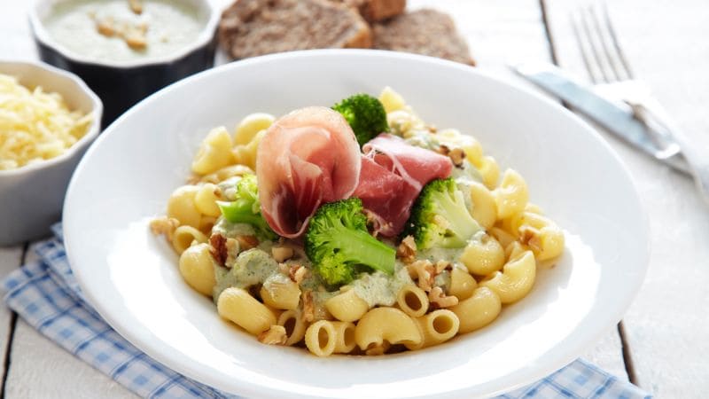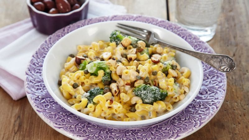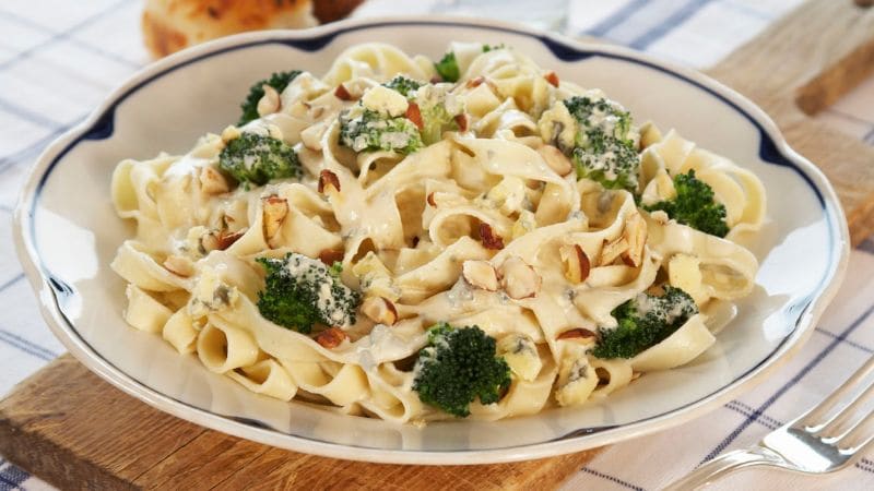 Med pikant ostesaus gjør vi båndspagetti og brokkoli til et spennende og delikat vegetarisk måltid. Som prikken over i'en strør vi hakkede nøtter rett før servering.