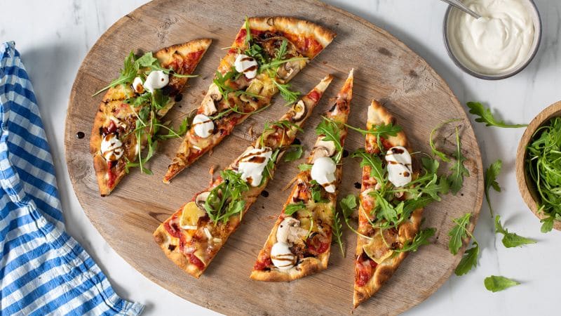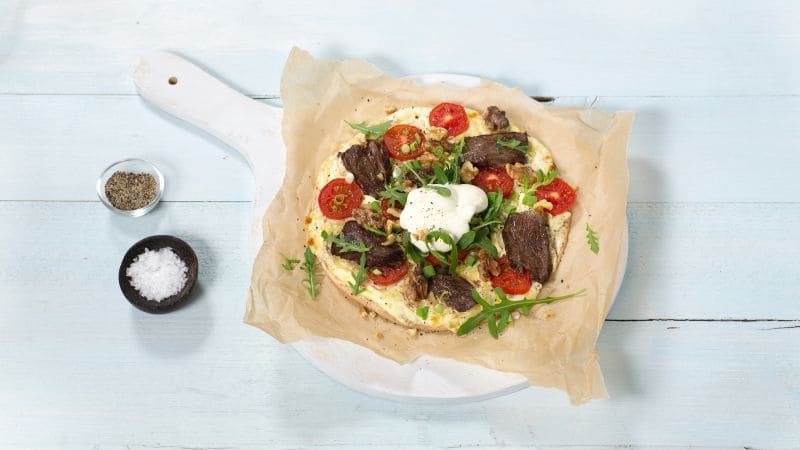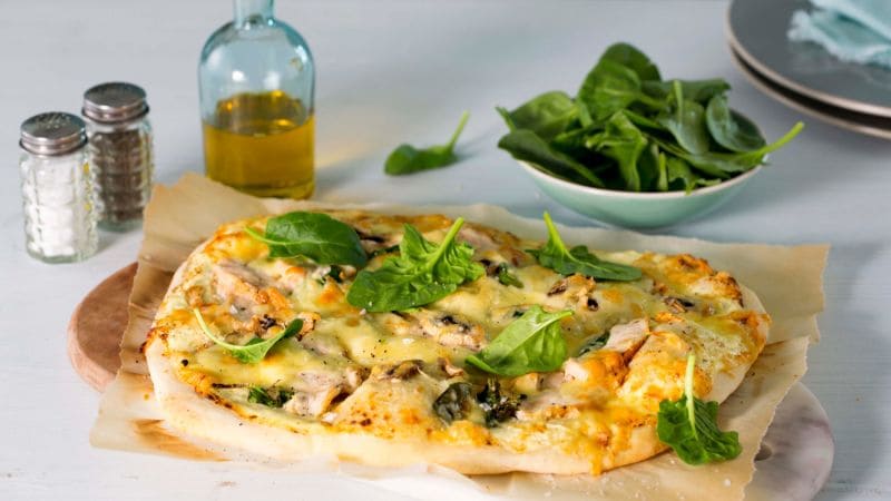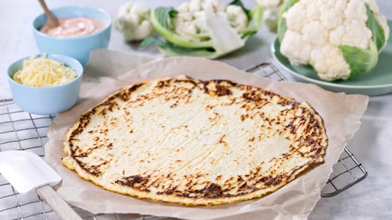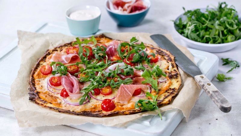 En original pizzavariant med spennende smak av bakt hvitløk, fyldig port salut, blomkål og bacon. Toppet med frisk ruccola blir dette helt sikkert en ny helgefavoritt.