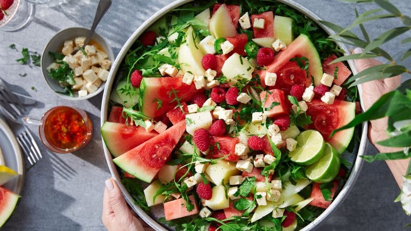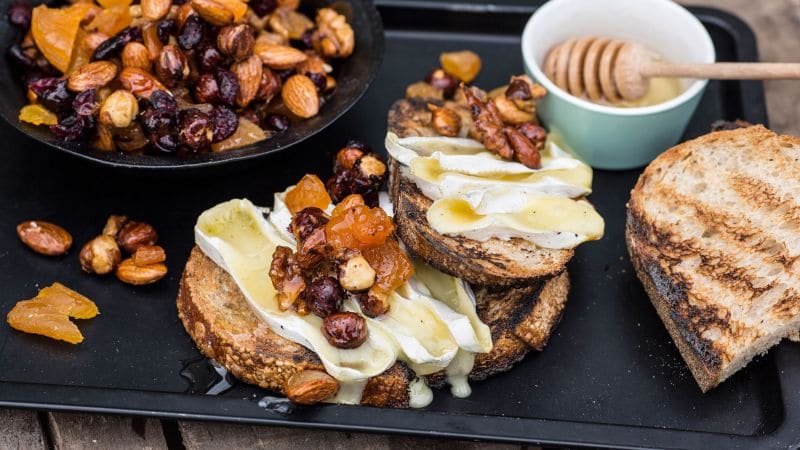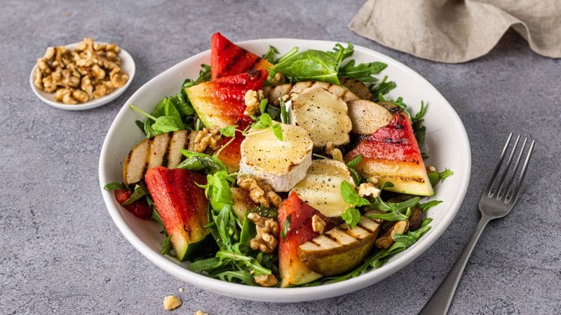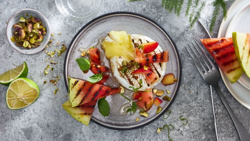 Grillet brie passer både til dessert og som tilbehør til biffen. Prøv denne spennende varianten med lun nektarin, vannmelon, honning og pistasjenøtter.