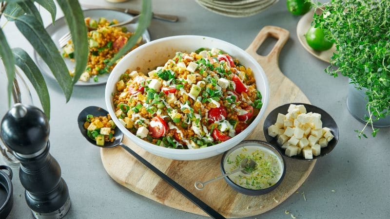 Tabbouleh er den friske smaken av Midtøsten og passer både som mettende salat alene eller som tilbehør til varmmaten. En smaksrik yoghurtdressing passer perfekt til.