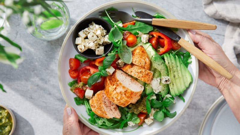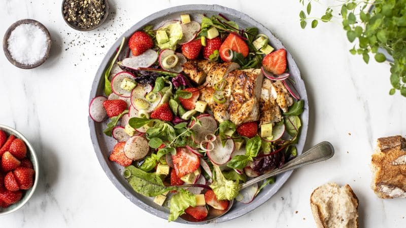 En fantastisk salat med avokado, jordbær og kylling passer perfekt på sommerbuffeten eller til lunsj en sval sommerdag. Dressingen laget fra stekesjyen smaker nydelig på.