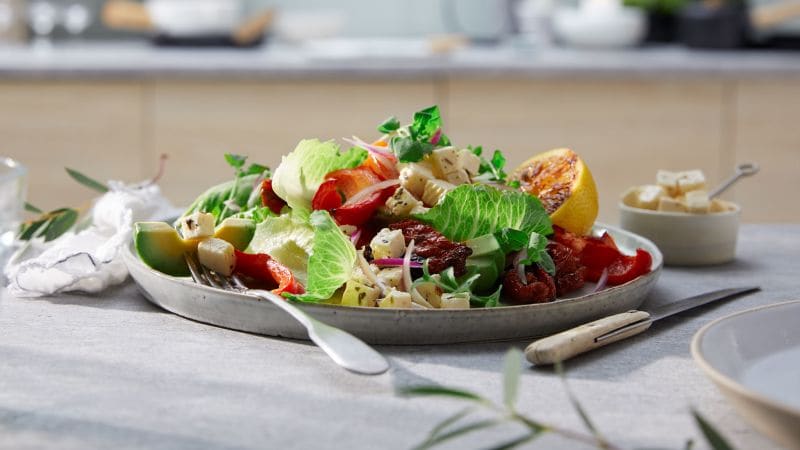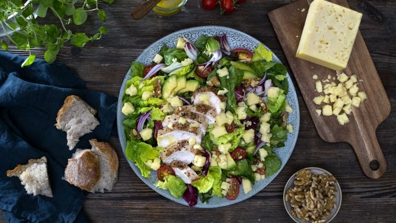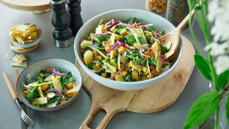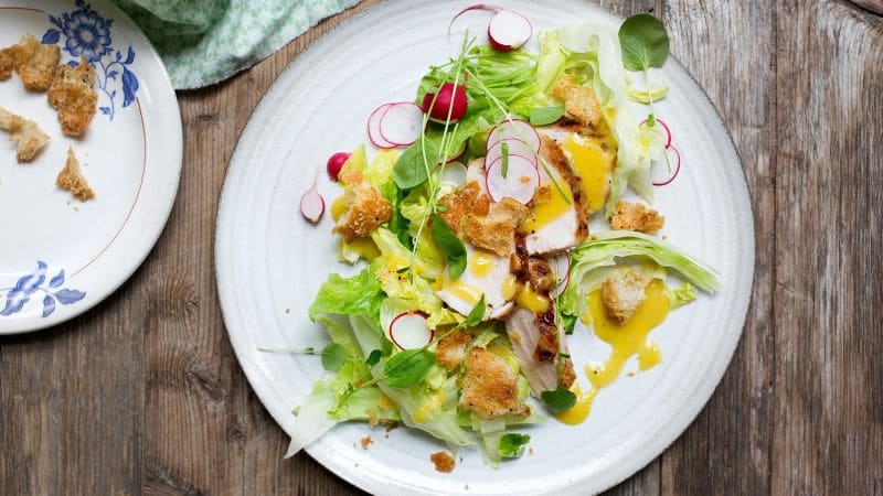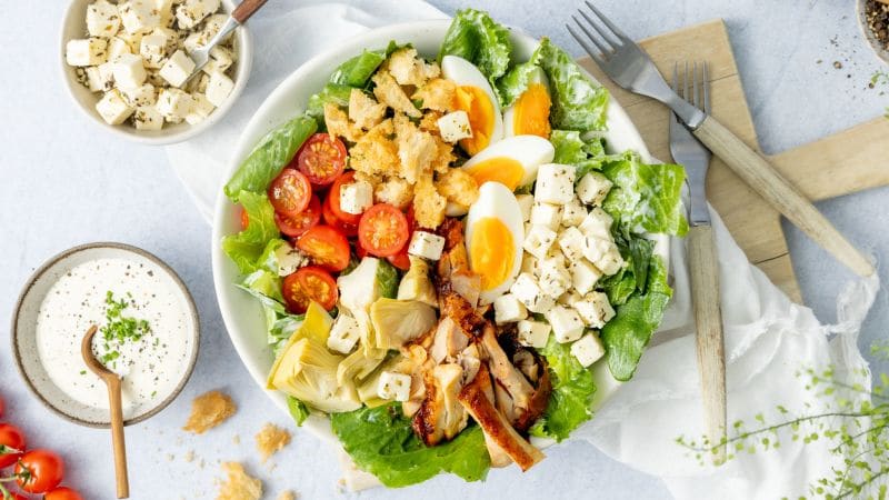 Cæsarsalat er en italiensk klassiker, som er enkel og rask å lage hjemme. Her har vi byttet ut parmesan med salatost og serverer hardkokt egg til, noe som gjør at salaten får et hint av Salat Nicoise, en klassisk salat fra Frankrike.