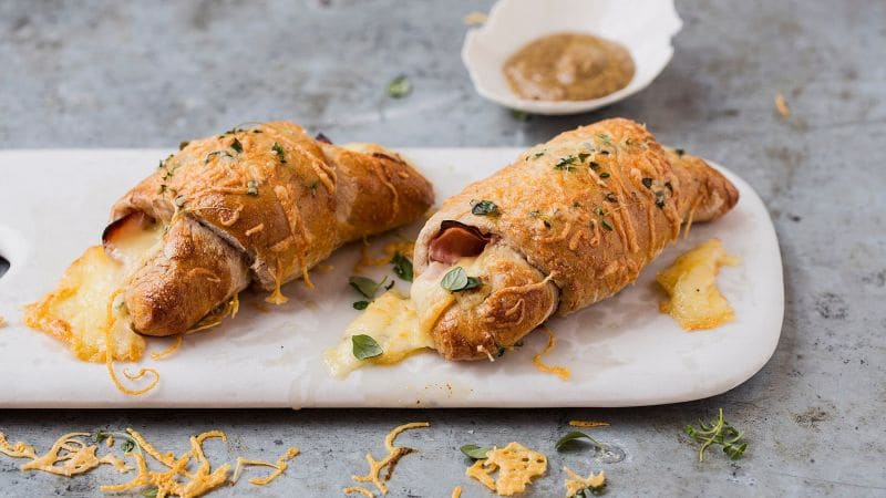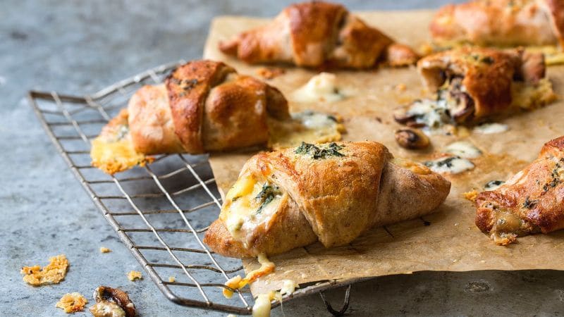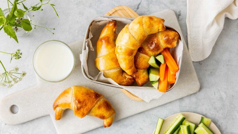 Horn baker du raskt med en ferdig grov pizzabunn. Sammen med en yoghurt og biter av for eksempel gulrot og agurk er disse fylte hornene super nistemat.