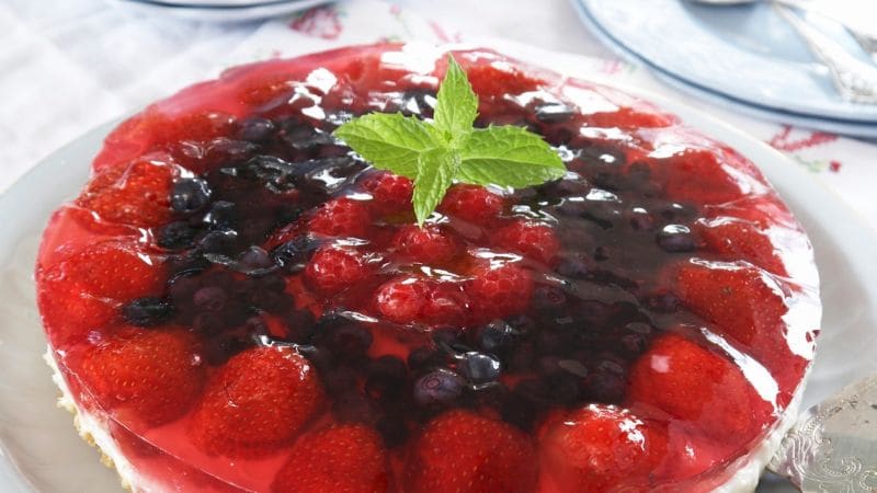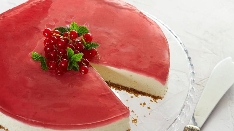 Oppskrift på en vidunderlig og festpyntet ostekake med kremost og et lekkert, rødt gelélokk. Kaken lages helt uten steking, men her må du beregne god tid for at den skal få stivnet godt. Her gjelder det å stålsette seg til å holde fingrene av fatet fram til den nydelige ostekaken i ca 10 porsjoner skal serveres til de heldige gjestene...