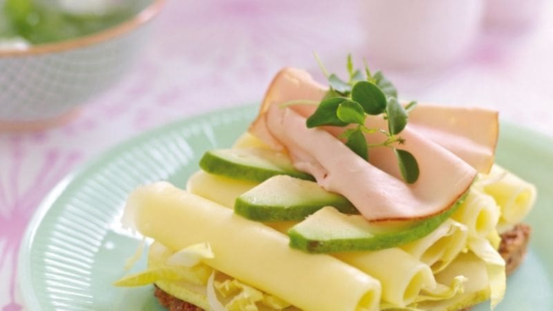 Rugbrød, endivesalat, avocado, pære og Norvegia. Unn deg litt luksus til frokost eller lunsj. Det kan også være et godt alternativ til den vanlige matpakken.