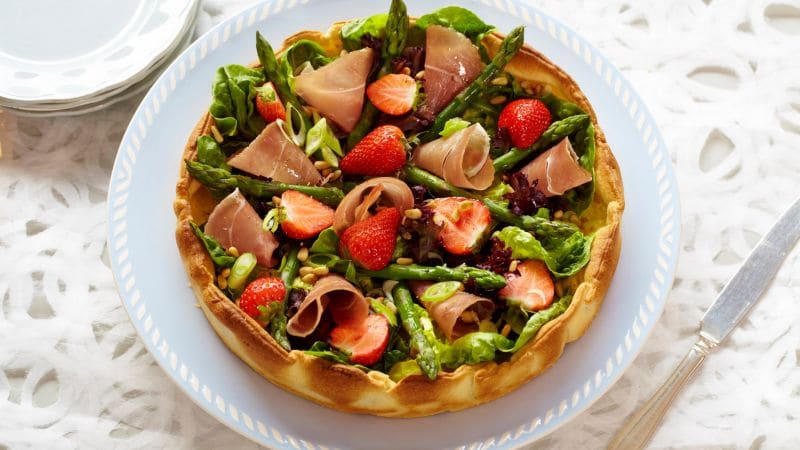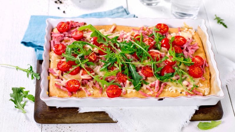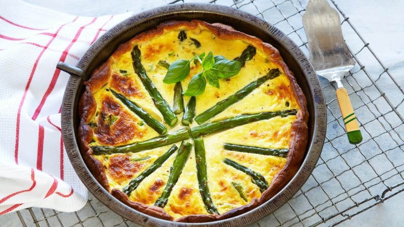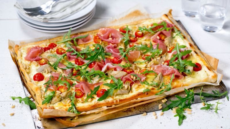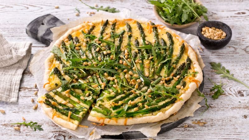 En fristende langpannepizza kan lages på mange måter! Her har vi byttet ut den tradisjonelle tomatsausen med Crème Fraîche. Toppet med asparges, god spekeskinke og basilikum er dette en pizza du garantert vil like.