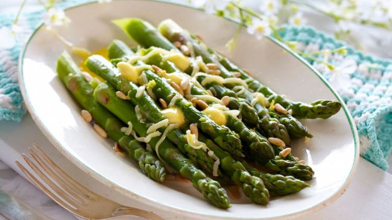 Oppskrift på asparges med sitronsmør og ost er en super forrett eller som en smårett på et tapasbord. Eller hva med å lage en god snack til deg selv? Pass på at aspargesene er nykokte og varme når de serveres.