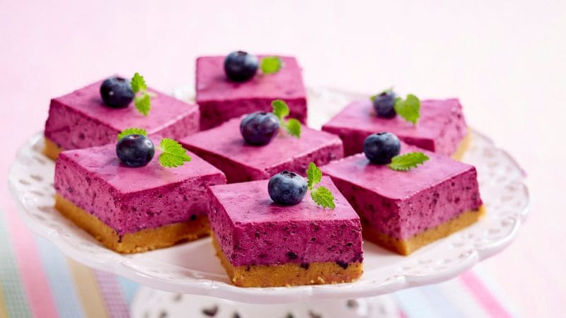 Dette er en frisk og god ostekake i langpanne. Blåbærene gir en nydelig farge. Kaken skal stivne i kjøleskapet, og kan derfor med fordel lages dagen før den skal serveres. Oppskriften gir ca. 18 ruter.
