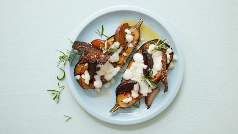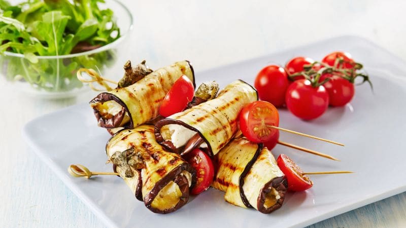 Prøv disse grillede aubergineskivene som er rullet med chevre og honning. Denne retten kan nytes som en forrett, eller som tilbehør til grillet svin og kylling.