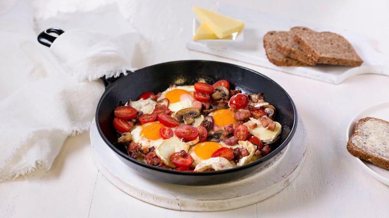 Dette er en rask måte å lage omelett på, ettersom eggene knekkes rett i panna. Med chevre, bacon og sopp i omeletten, og grovbrød til, blir dette en god og mettende middag.