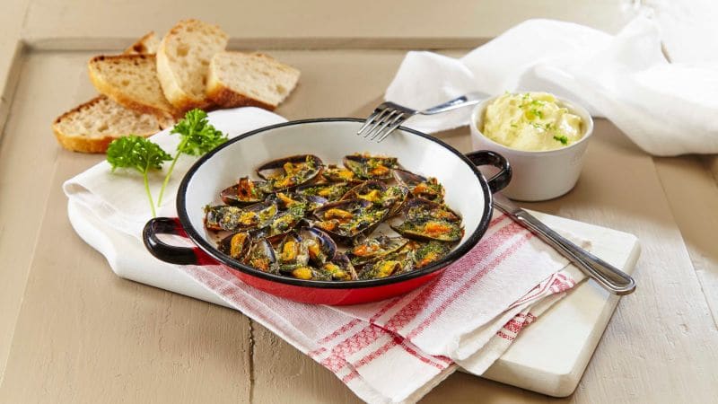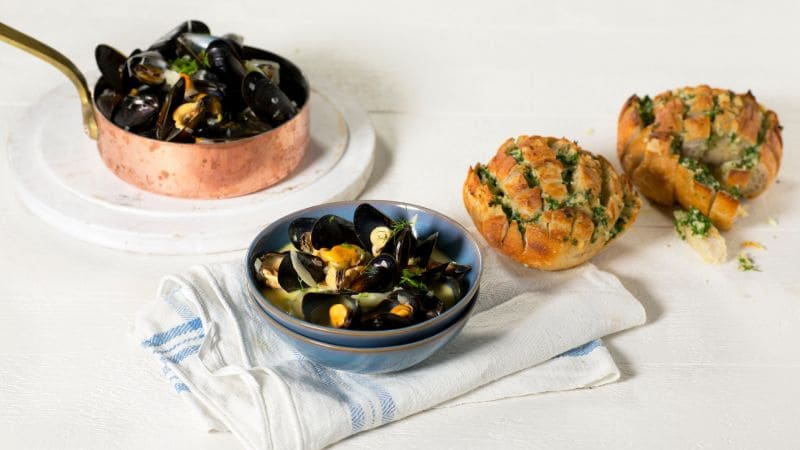 Blåskjell er enkel mat hele året og smaker aller best på vinteren. Her serveres de smaksrike skjellene i en kremet saus med fennikel og et deilig og originalt hvitløkbrød.