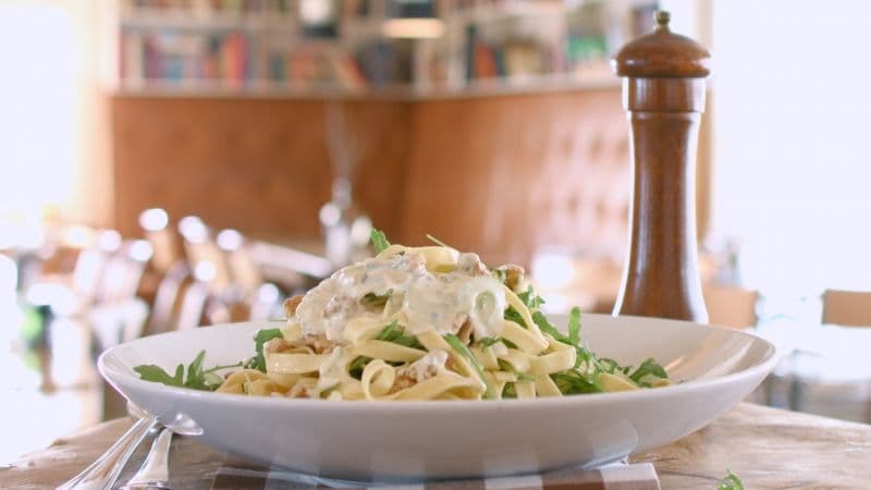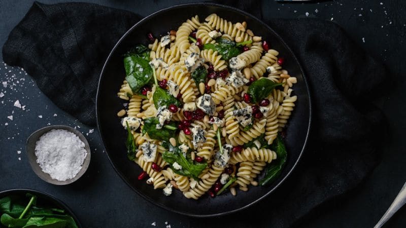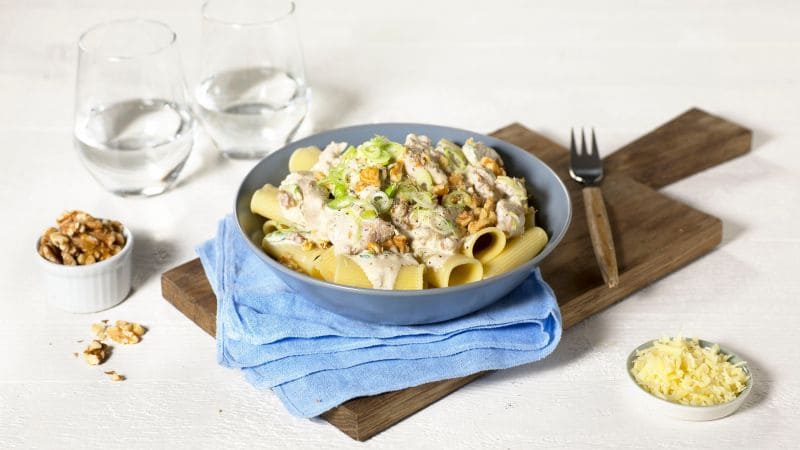 Alle elsker pasta! Oppskrift på en rask og velsmakende middag. Blåmuggostsaus laget på Selbu Blå, stangselleri, sjalottløk og hvitløk gir mye smak på en enkel måte. Serveres med ruccola og ristede valnøtter.
