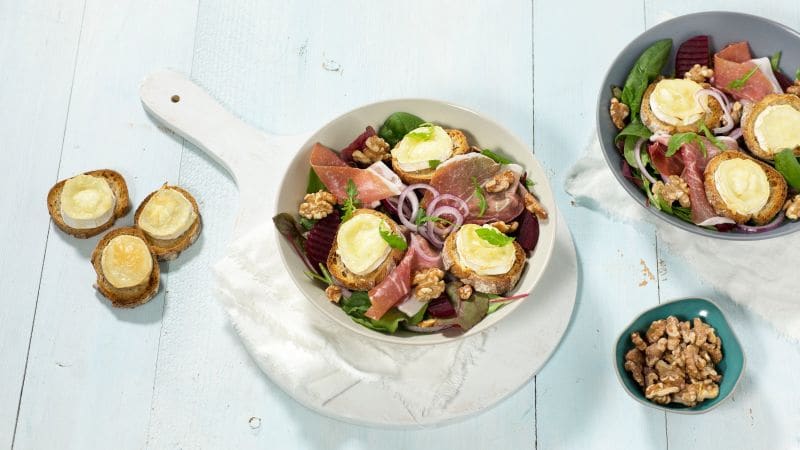 En salat med ost, pærer og nøtter er spennende og med en nybakte osteloff passer denne salaten perfekt til klubbkvelder og lange venninnetreff. Dressingen vil du bli husket lenge for.
