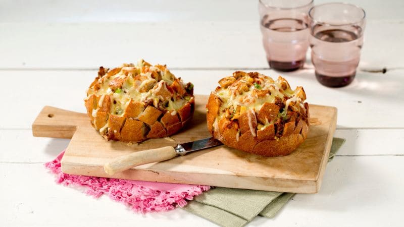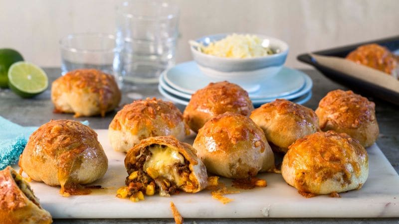 Runddstykker fylt med taco er en kul og morsom måte å server brødmat på. Disse store rundstykkene er fylt med tacokjøtt og smeltet ost. Perfekt til tapas, supper eller lunsj.