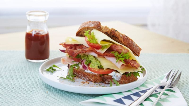 Klassisk sandwich med kylling, parmaskinke, avocado, vellagret Norvegia og rød majones. Server til fornøyde gjester eller gjør litt ekstra ut av en lunsj til deg selv.