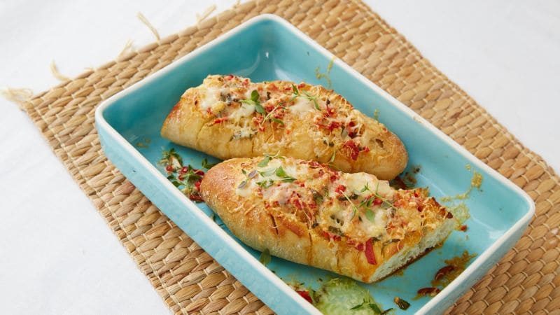 Oppskrift på en nydelig baguett stekt i ovn, snittet og fylt med chili - og hvitløkssmør, pepperoni og drysset med saftig ost og friske urter. Dette er virkelig kosemat med stor K!
