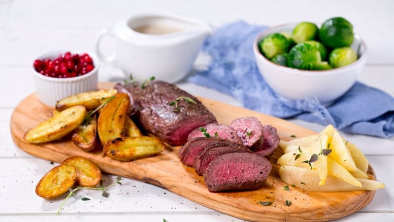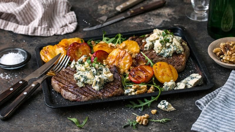 Et godt, saftig stykke oksekjøtt er luksus. Topp det med en god blåmuggost, og server med ovnsbakte poteter, grillede tomater og friske, grønne bønner.