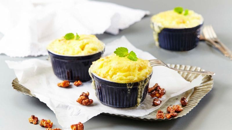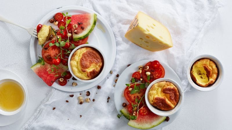 Sufflé er tradisjonelt en slags omelett laget med stivpiskede eggehviter. Her er en enklere oppskrift på suffle laget i porsjonsformer med nydelig Camembert og Jarlsberg®, hvor du slipper å skille eggeplommen fra eggehviten. Soufflé passer ypperlig å servere som en forrett, mellomrett eller en lun kveldsrett. Som tilbehør kan du servere for eksempel en frisk salat og nybakt brød.