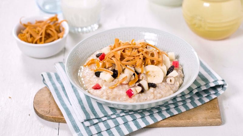 Havregrøt toppet med cottage cheese gir ekstra mye protein. Toppet med brunost, tørkede tranebær og frø er dette en perfekt frokost eller mellommåltid.