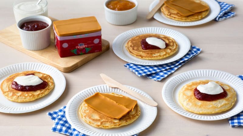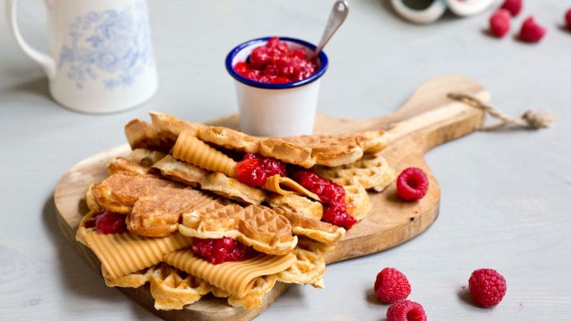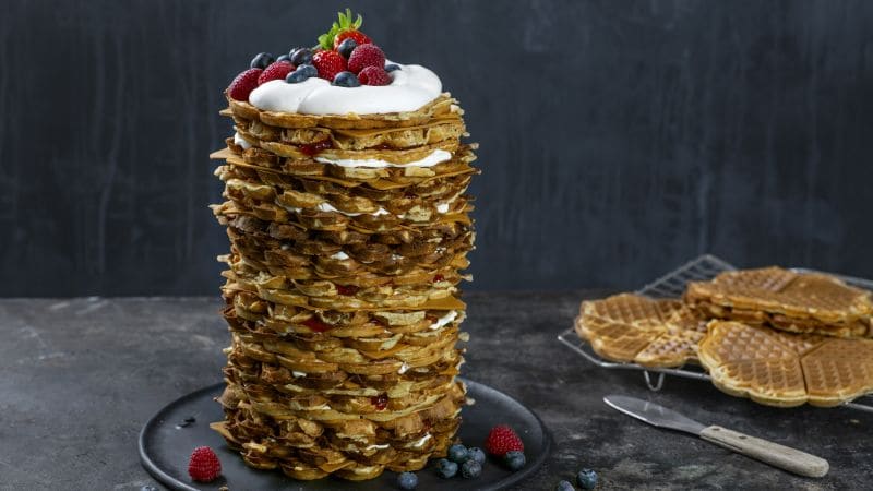 Server vafler på en morsom måte ved å stable dem i et stort tårn! Legg brunost, syltetøy og digg rømme mellom lagene. Av denne røra blir det ca. 30 vafler.