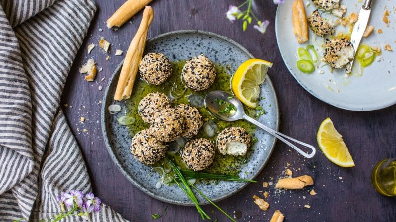 Prøv denne oppskriften på osteboller av kremost, gressløk, sitron og vårløk rullet i sesamfrø. Nydelig som en liten forrett, eller som tapas når du har gjester og serverer mange småretter.