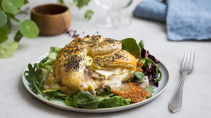 Rennende brie med bacon er det som møter deg når du setter tennene i denne herligheten. Innbakt i butterdeig er dette perfekt selskapsmat. Sett en midt på bordet og sett gaffelen i.