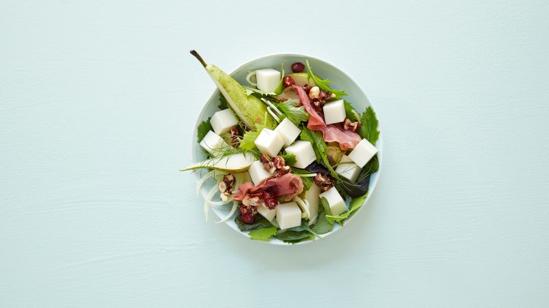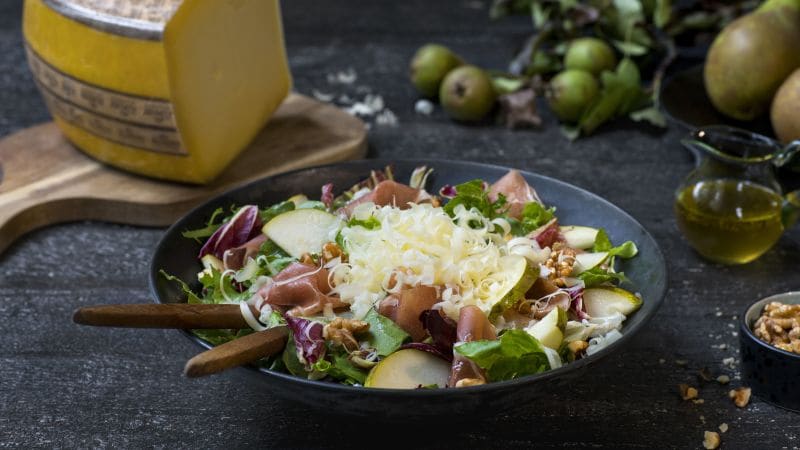 TINE® Norsk Alpeost, en smaksrik, hard gulost, er perfekt å høvle over salater. Med salt spekeskinke, saftige pærer og en god honningdressing blir dette rene festmåltidet.