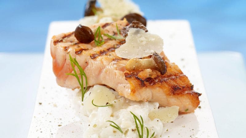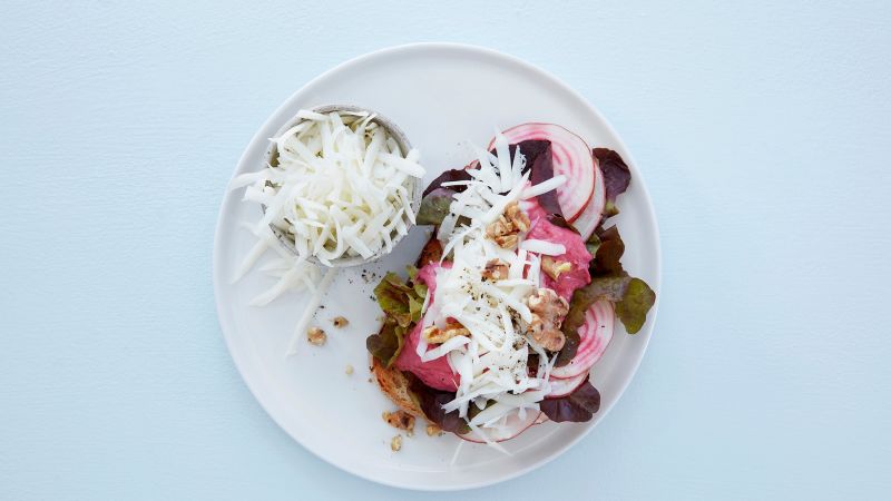 En frisk variant med knasende salat av eple, selleri og valnøtter på toppen av et gratinert ostelokk. Med blåmuggost i sausen blir dette en fantastisk opplevelse.